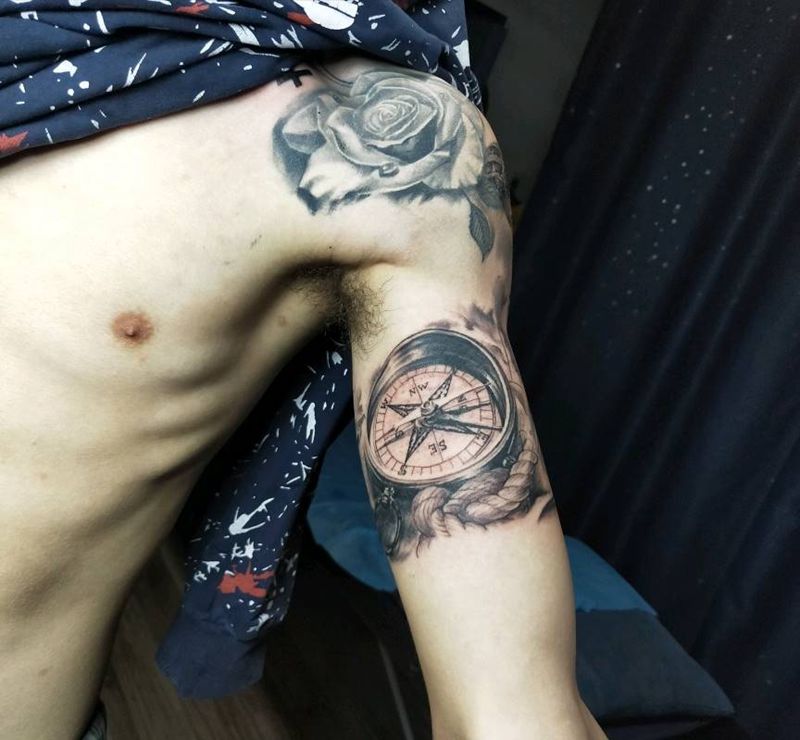 天使流浪迷路了′幸好有指南针纹身图片_肩部手臂欧美写实纹身图案