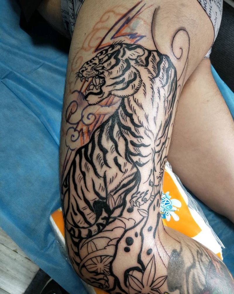 腿上的老虎纹身图片_腿部老传统老虎纹身图案