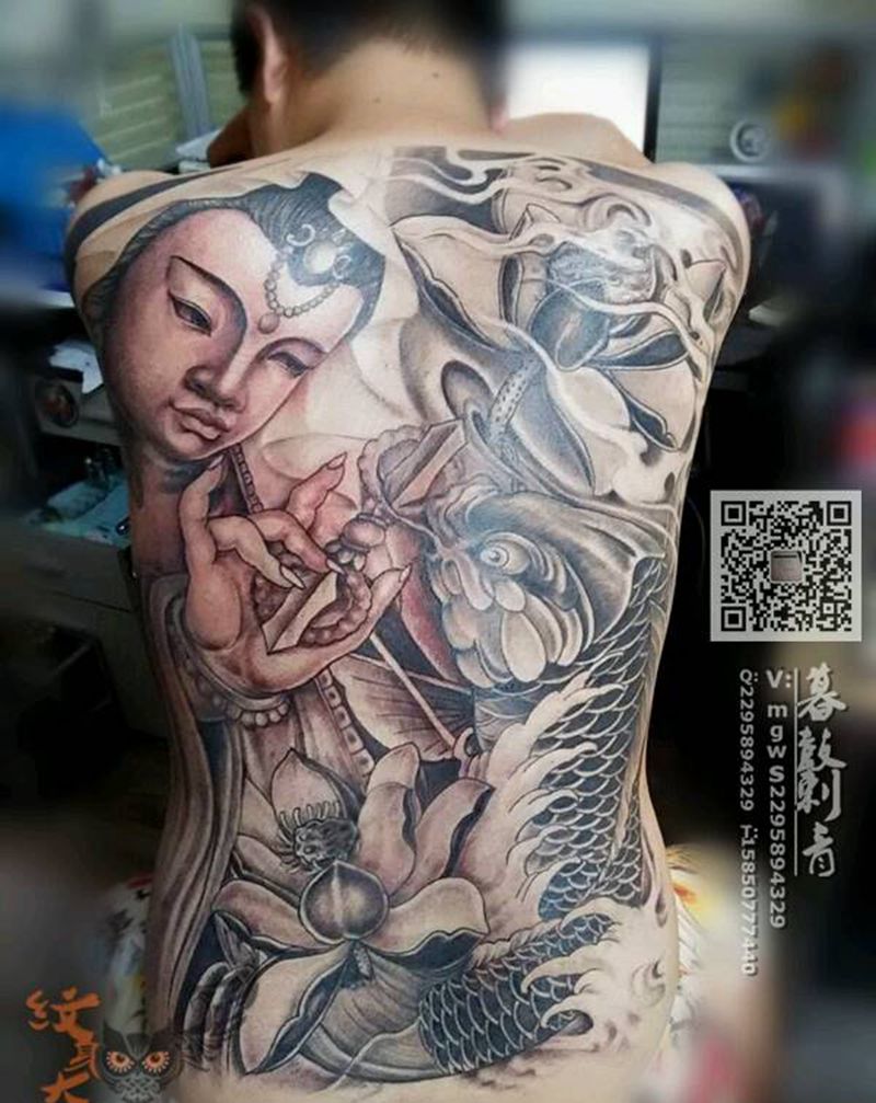 当前位置: 首页 >江苏省南京市纹身店-暮鼓刺青纹身图案>满背~~福鱼观自在纹身图片_背部传统动物人物植物鬼神宗教纹身图案