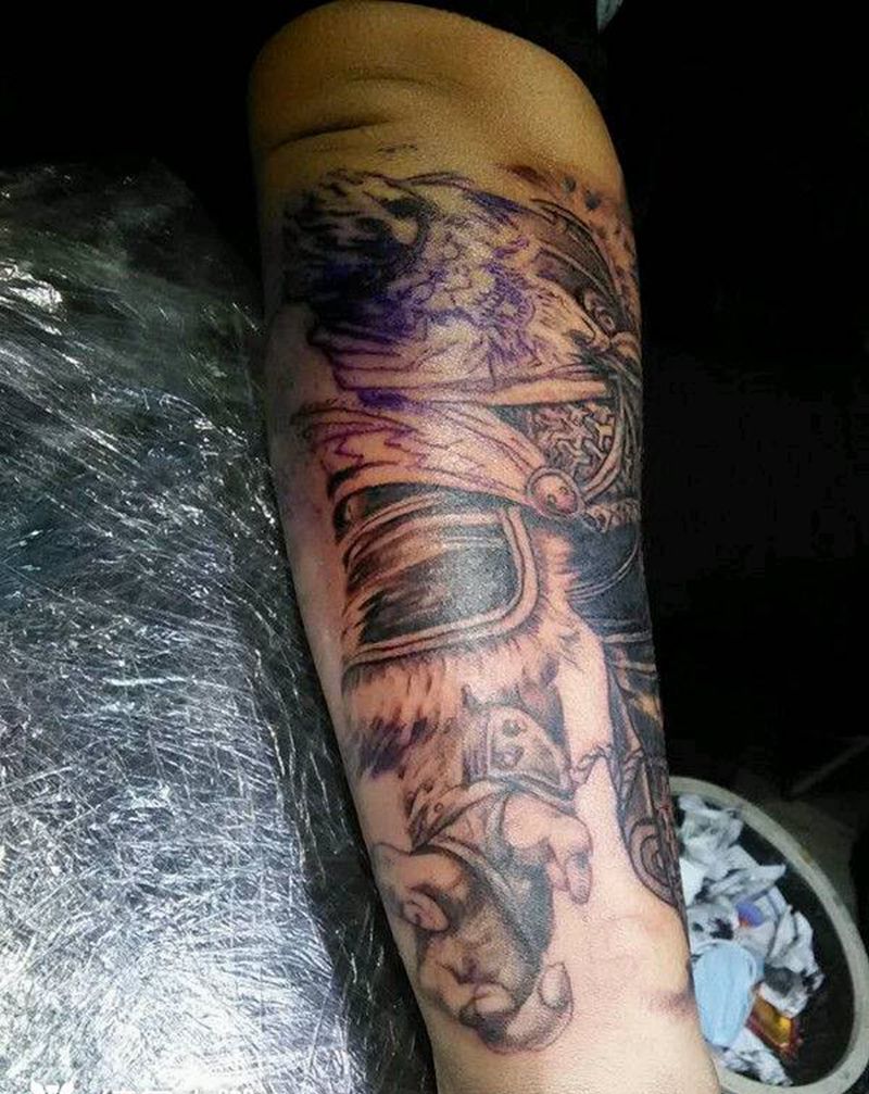 当前位置: 首页 >江苏省南京市纹身店-暮鼓刺青纹身图案>悟空(遮盖)勉为其难纹身图片_手臂传统成品纹身图案