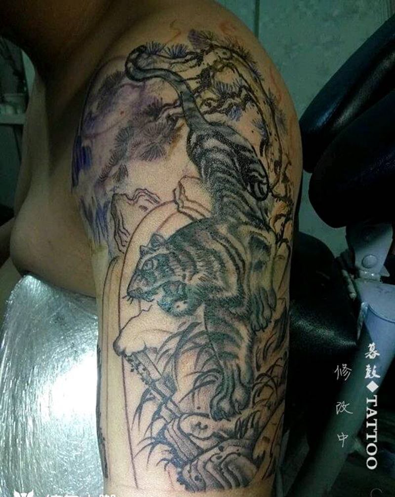 当前位置: 首页 >江苏省南京市纹身店-暮鼓刺青纹身图案>旧老虎添色加大纹身图片_手臂传统动物成品纹身图案