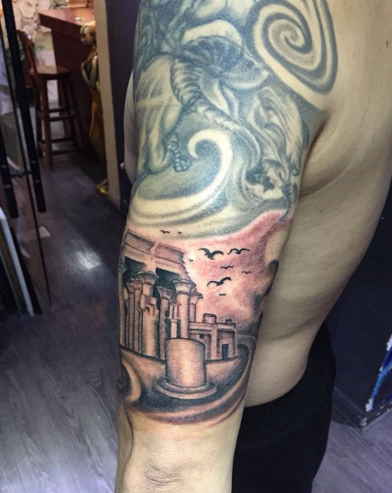 当前位置: 首页 >江苏省南京市纹身店-南京老山刺青纹身图案>老纹身添加欧美建筑风格纹身图片