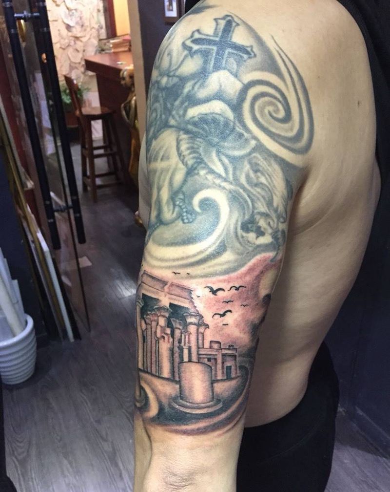 当前位置: 首页 >江苏省南京市纹身店-南京老山刺青纹身图案>老纹身添加欧美建筑风格纹身图片