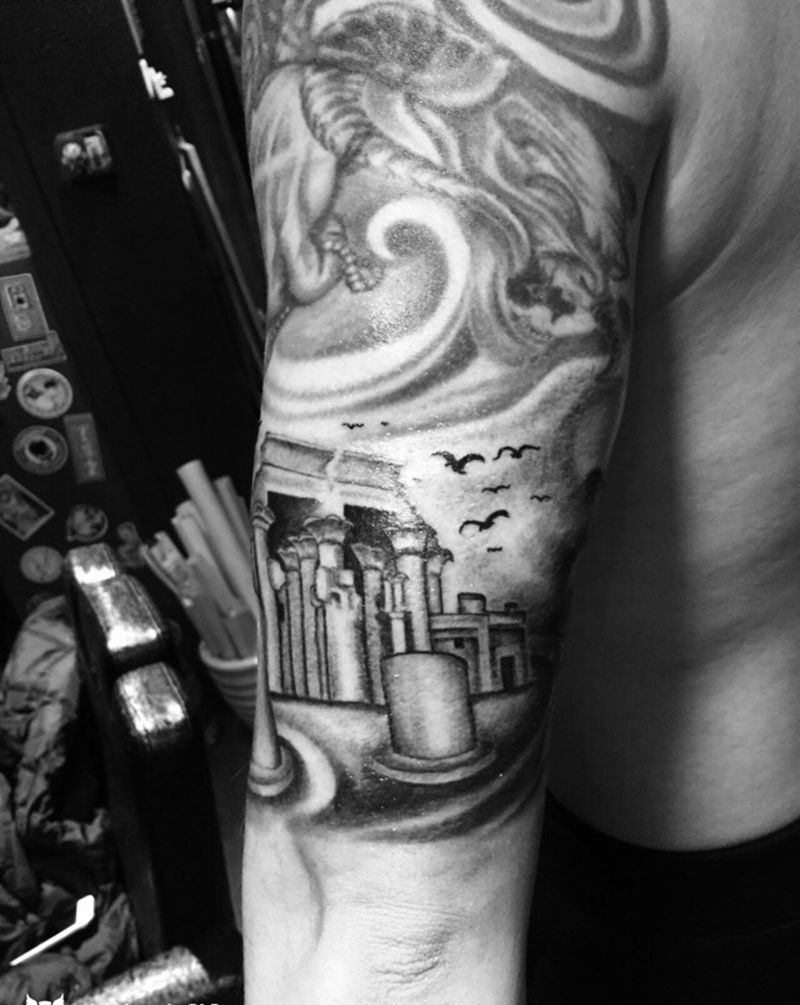 当前位置: 首页 >江苏省南京市纹身店-南京老山刺青纹身图案>老纹身添加欧美建筑风格纹身图片
