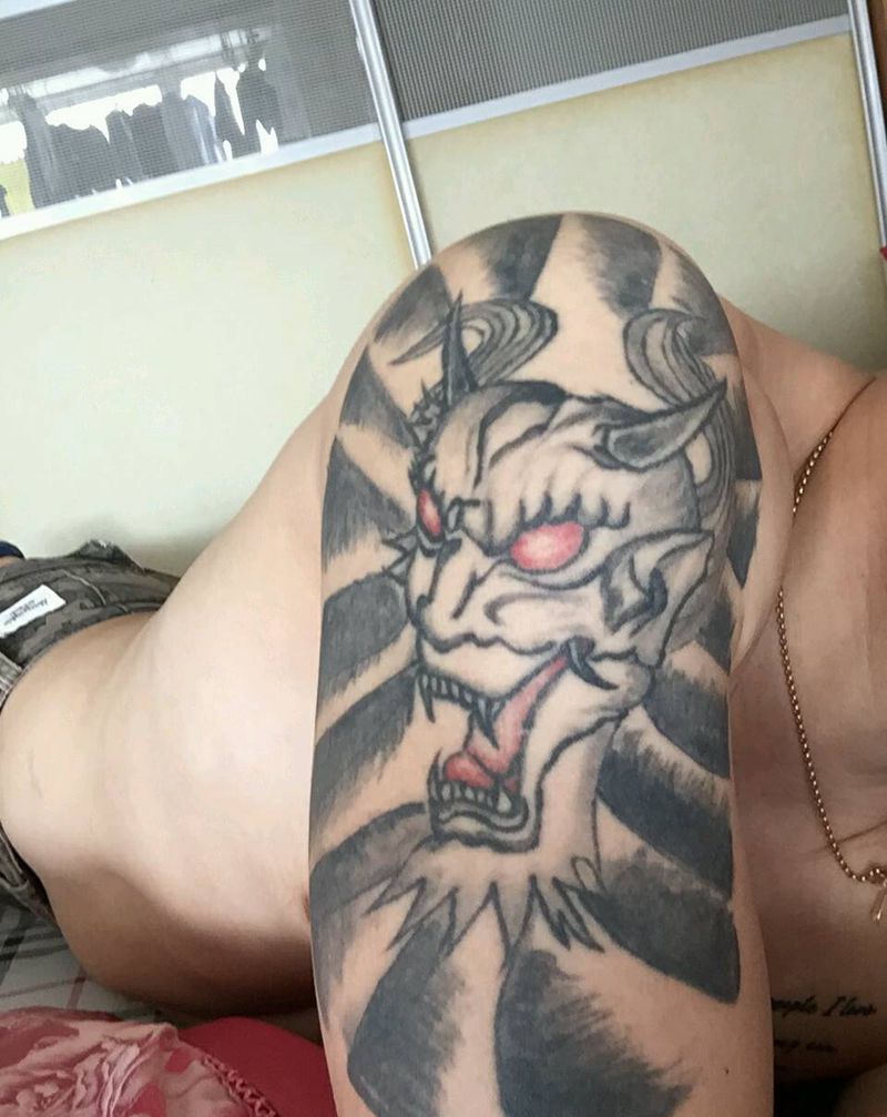 麻药效果遮盖修改纹身图片_肩部传统鬼神纹身图案