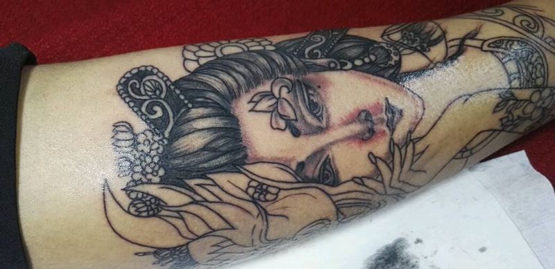 艺妓纹身图片_腿部传统人物成品纹身图案