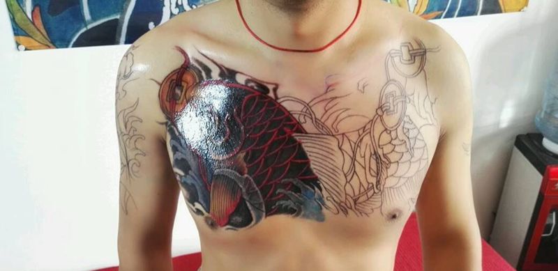 当前位置: 首页 >江苏省南京市纹身店-南京格调纹身(收学员)微:ke79798纹身图案>花胸遮盖修改!未完成纹身图片_胸部传统动物成品纹身图案