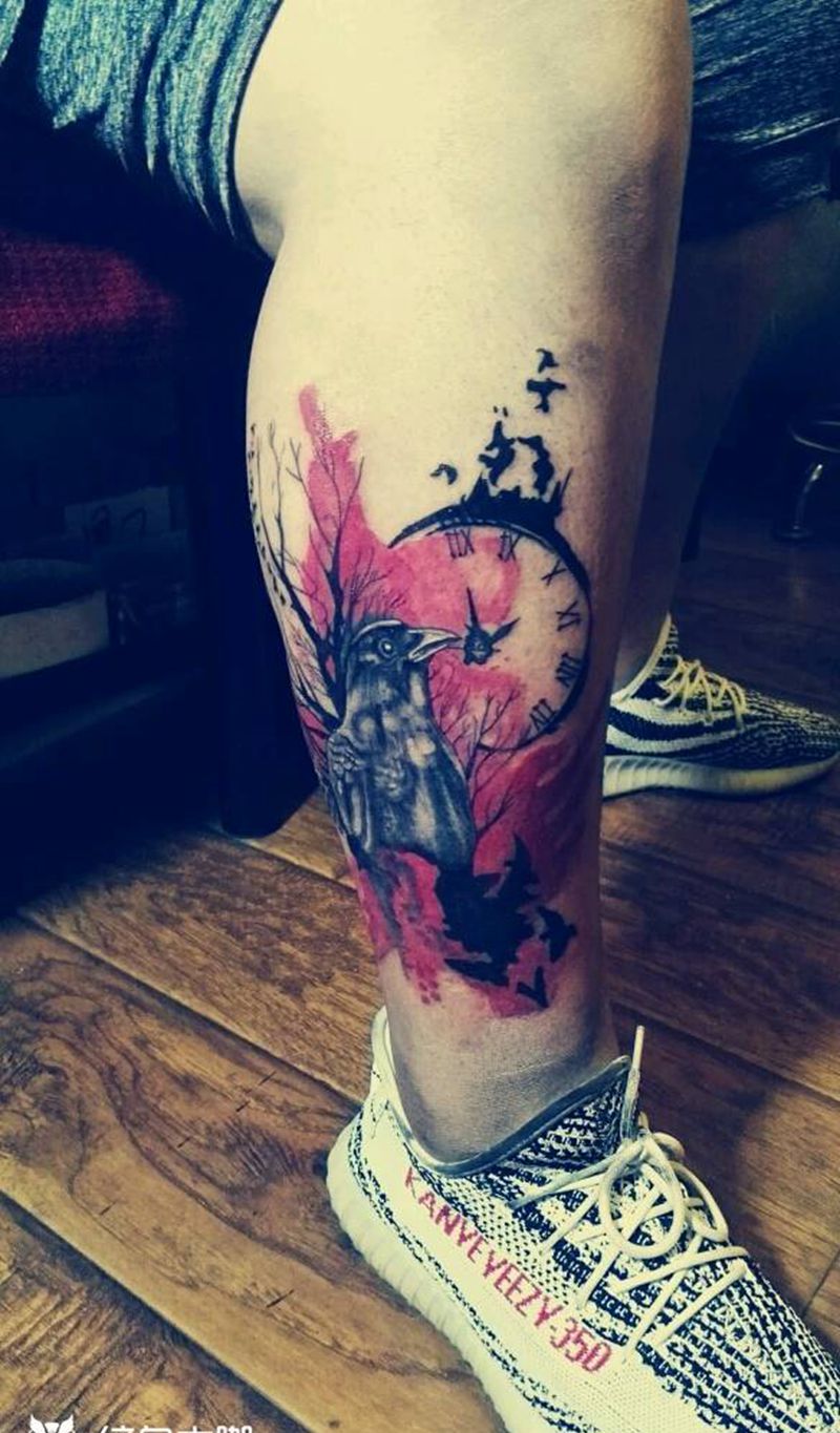 水墨乌鸦纹身图片_腿部欧美字符动物植物成品纹身图案