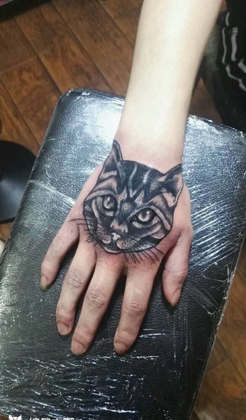手掌猫咪!纹身图片_手臂欧美动物成品纹身图案