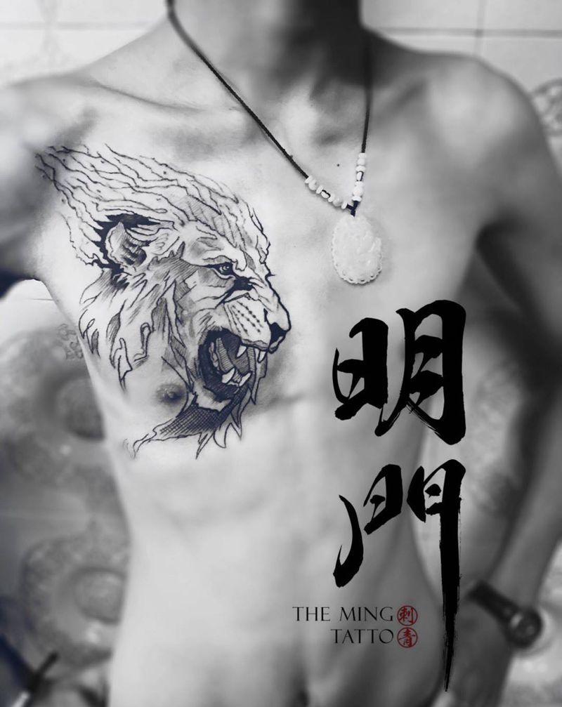 简约线条狮子纹身图片_胸部几何纹身图案