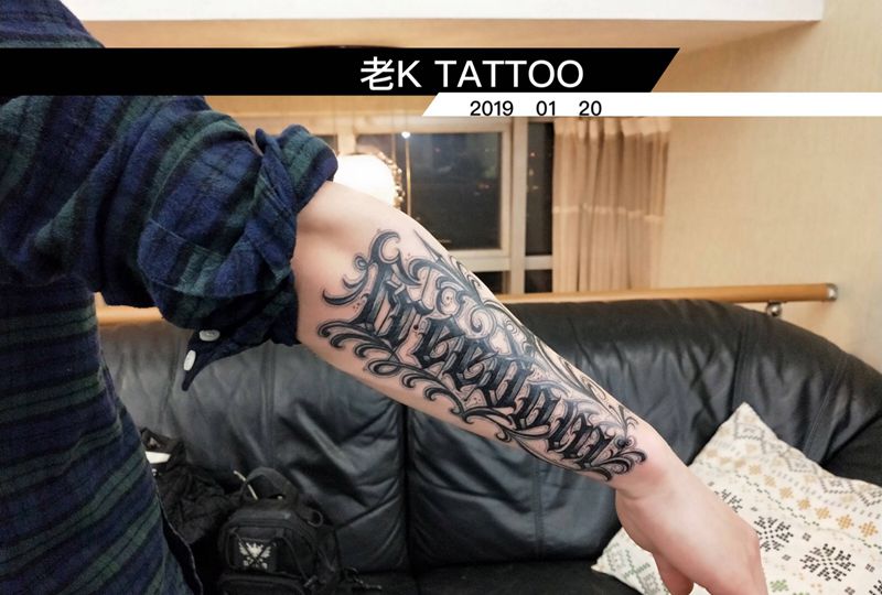 当前位置: 首页 >江苏省南京市纹身店-老K TATTOO纹身图案>花体字纹身图片_手臂花体字纹身图案