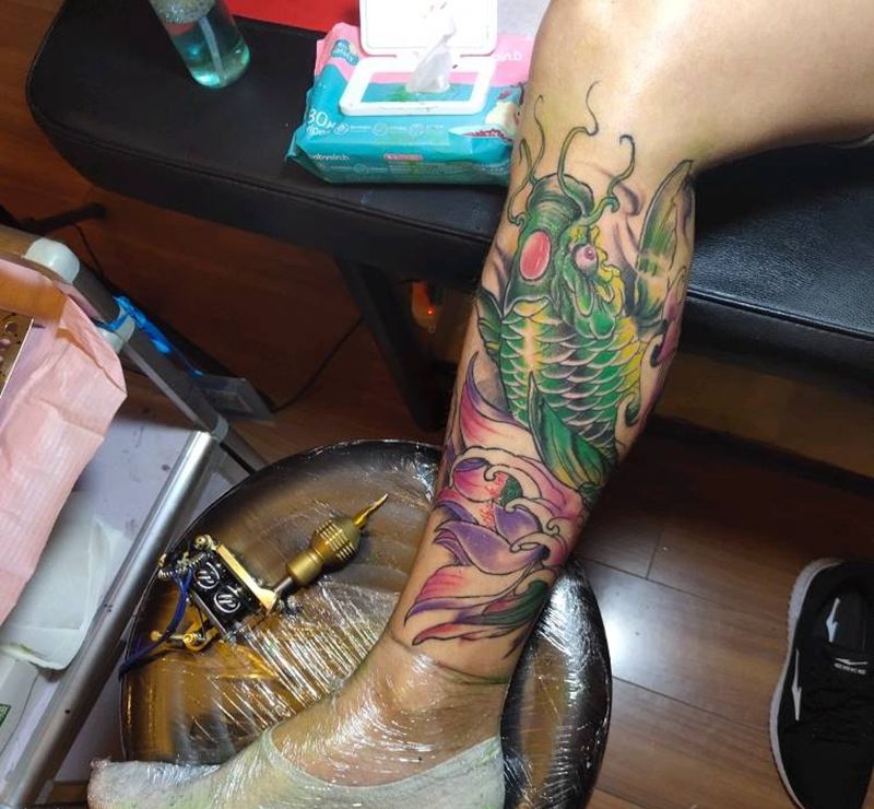 当前位置: 首页 >江苏省南京市纹身店-胖虎TATTOO纹身图案>鲤鱼纹身图片_腿部老传统鲤鱼·莲花纹身图案