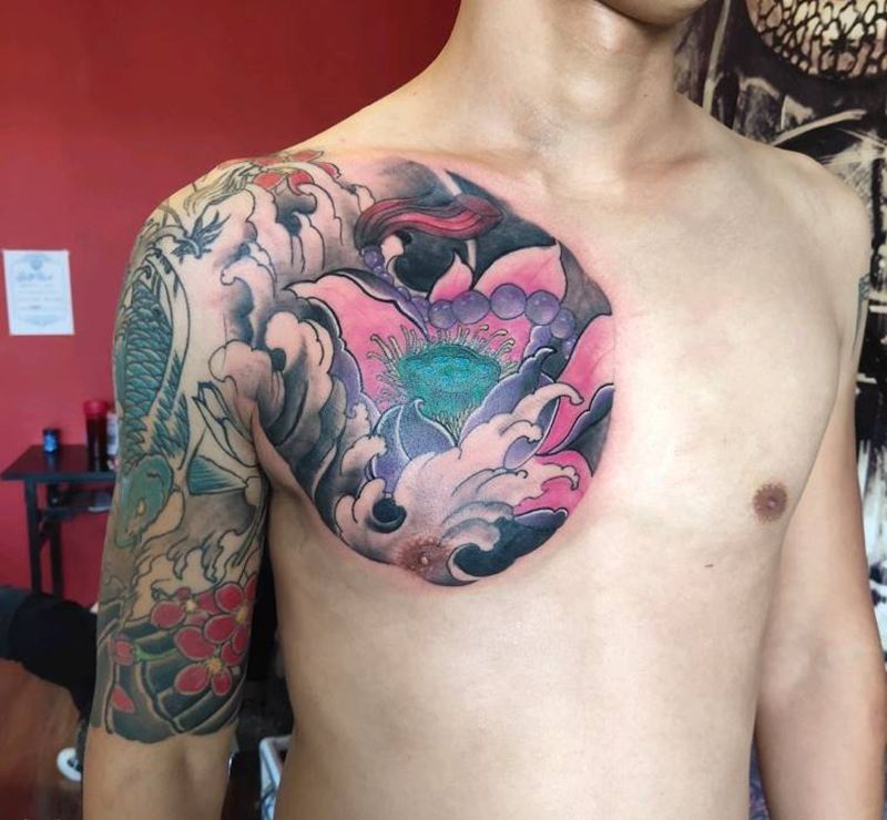 花胸半甲纹身图片_胸部老传统莲花纹身图案