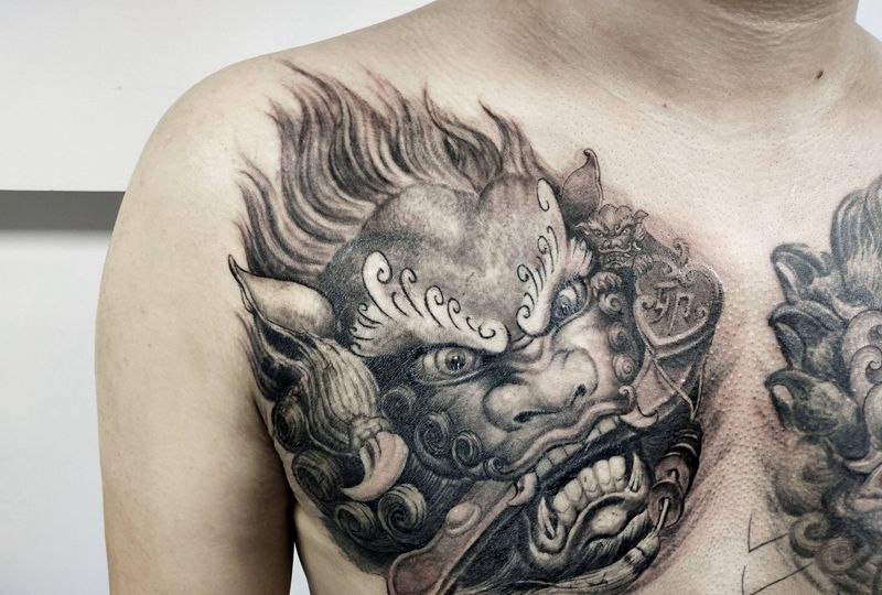 事事(狮狮)如意纹身图片_胸部新传统唐狮纹身图案