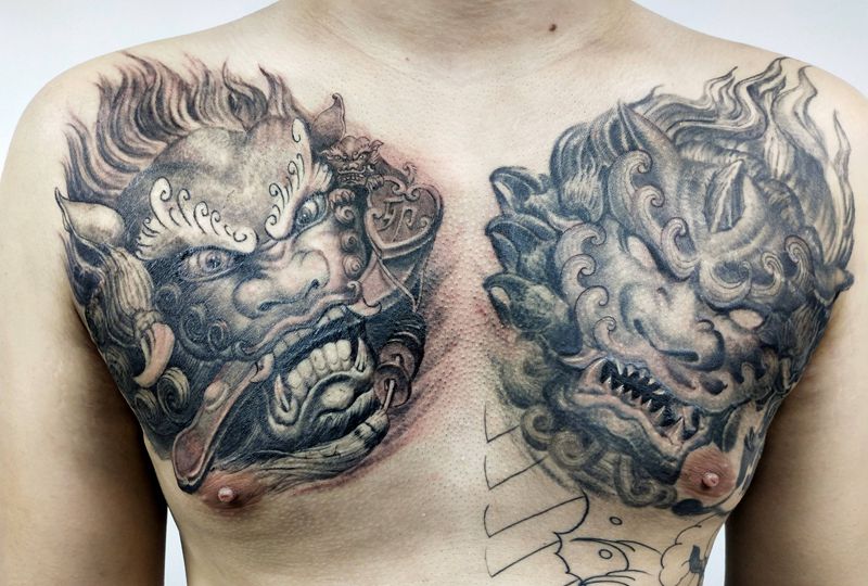 事事(狮狮)如意纹身图片_胸部新传统唐狮纹身图案