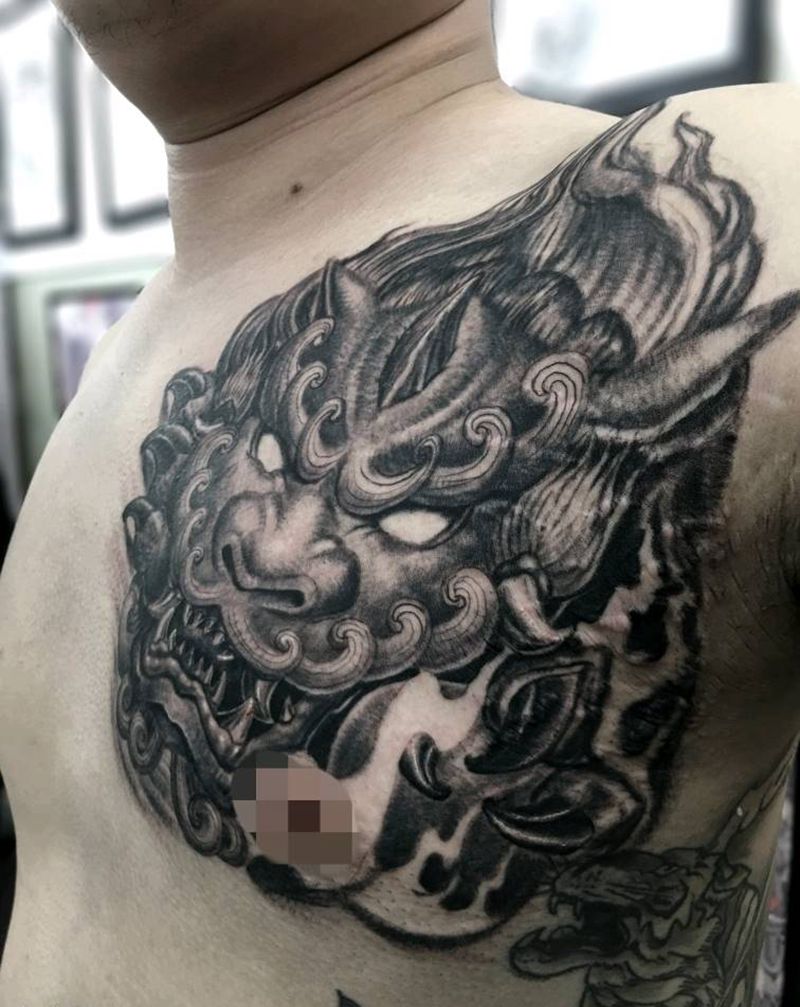 当前位置: 首页 >江苏省南京市纹身店-老K TATTOO纹身图案>手绘胸口唐狮纹身图片_胸部新传统唐狮花胸纹身图案