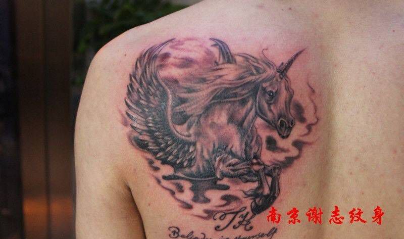 独角兽纹身图片_成品背部肩部传统清新写实动物原创纹身图案
