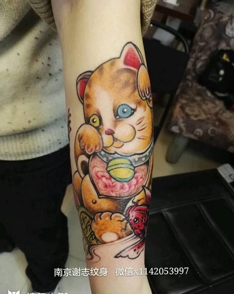当前位置: 首页 >江苏省南京市纹身店-南京谢志-刺青 Tattoo纹身图案>招财猫纹身图片_手臂传统动物原创成品纹身图案
