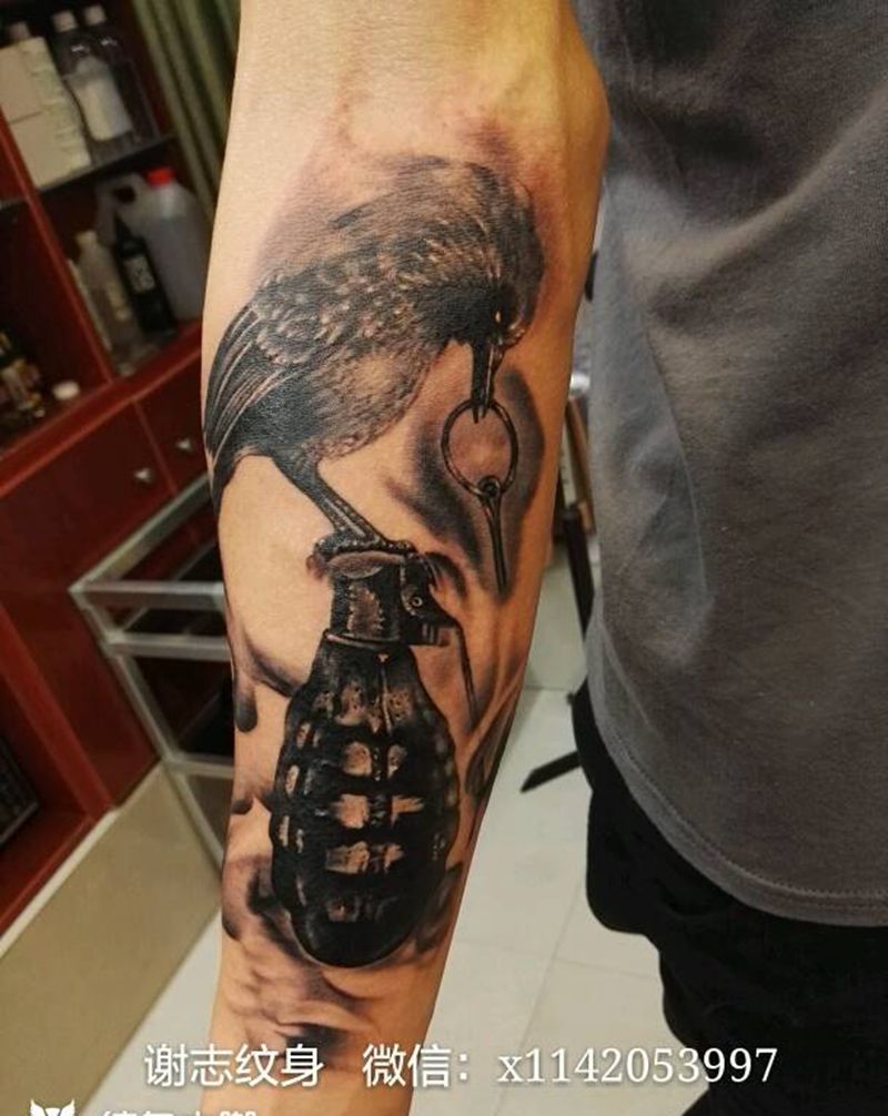 当前位置: 首页 >江苏省南京市纹身店-南京谢志-刺青 Tattoo纹身图案>乌鸦与手雷纹身图片_手臂欧美写实动物原创成品纹身图案