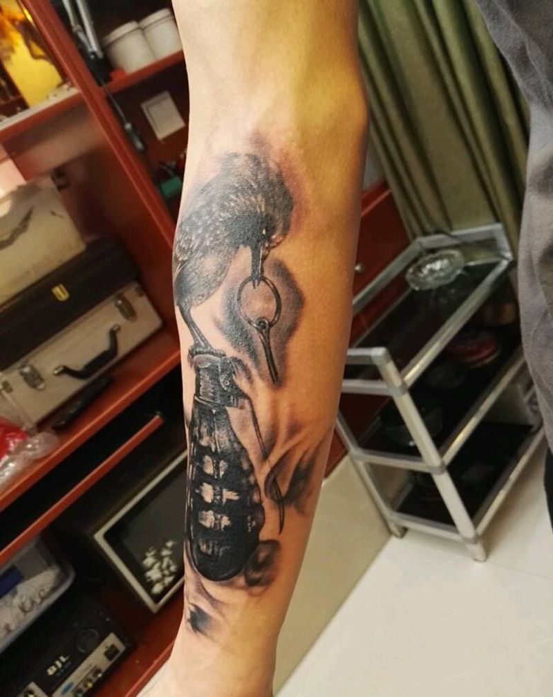 乌鸦与手雷纹身图片_手臂欧美写实动物原创成品纹身图案
