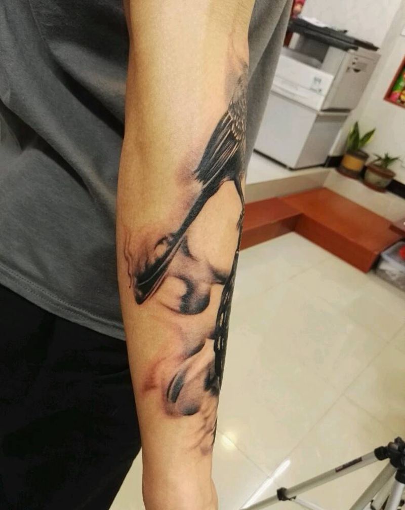 当前位置: 首页 >江苏省南京市纹身店-南京谢志-刺青 Tattoo纹身图案>乌鸦与手雷纹身图片_手臂欧美写实动物原创成品纹身图案