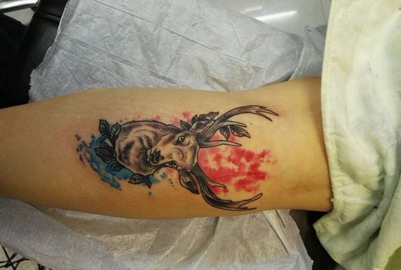 当前位置: 首页 >江苏省南京市纹身店-南京谢志-刺青 Tattoo纹身图案>水墨麋鹿纹身图片_腿部清新动物原创成品纹身图案
