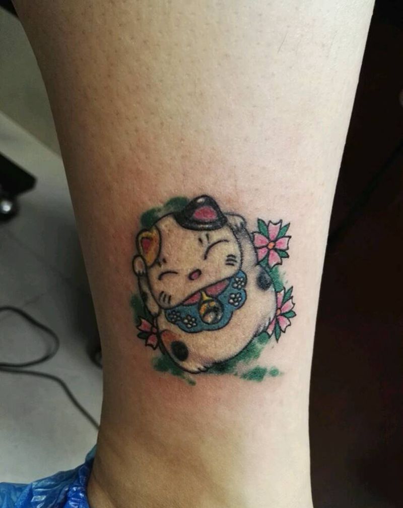 招财猫纹身图片_腿部清新动物原创成品纹身图案