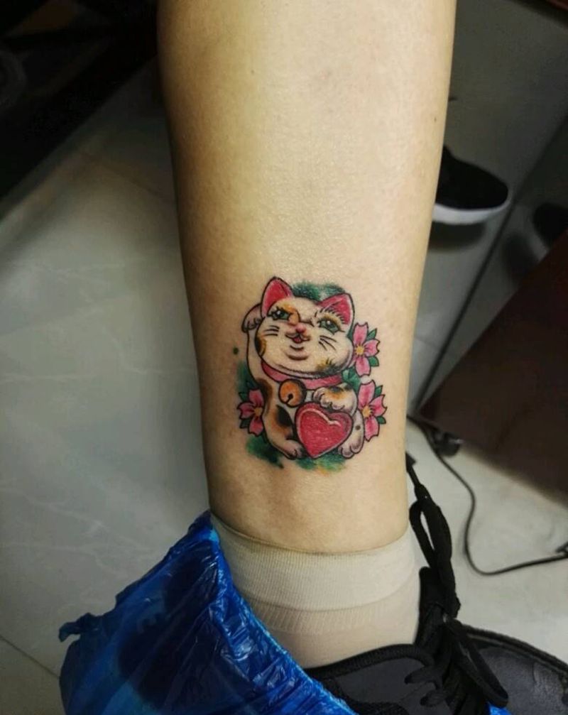 招财猫纹身图片_腿部清新动物原创成品纹身图案