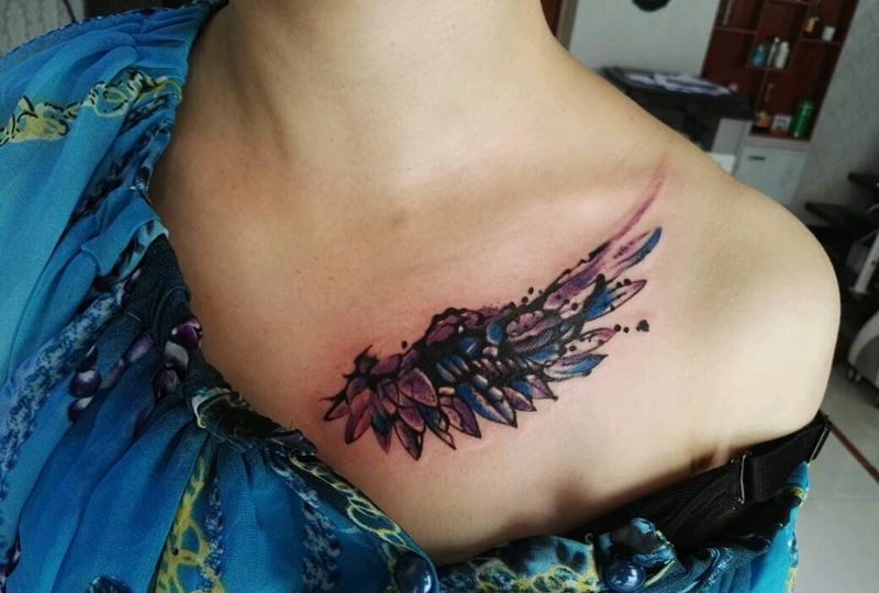 水墨翅膀纹身图片_胸部清新动物原创成品纹身图案