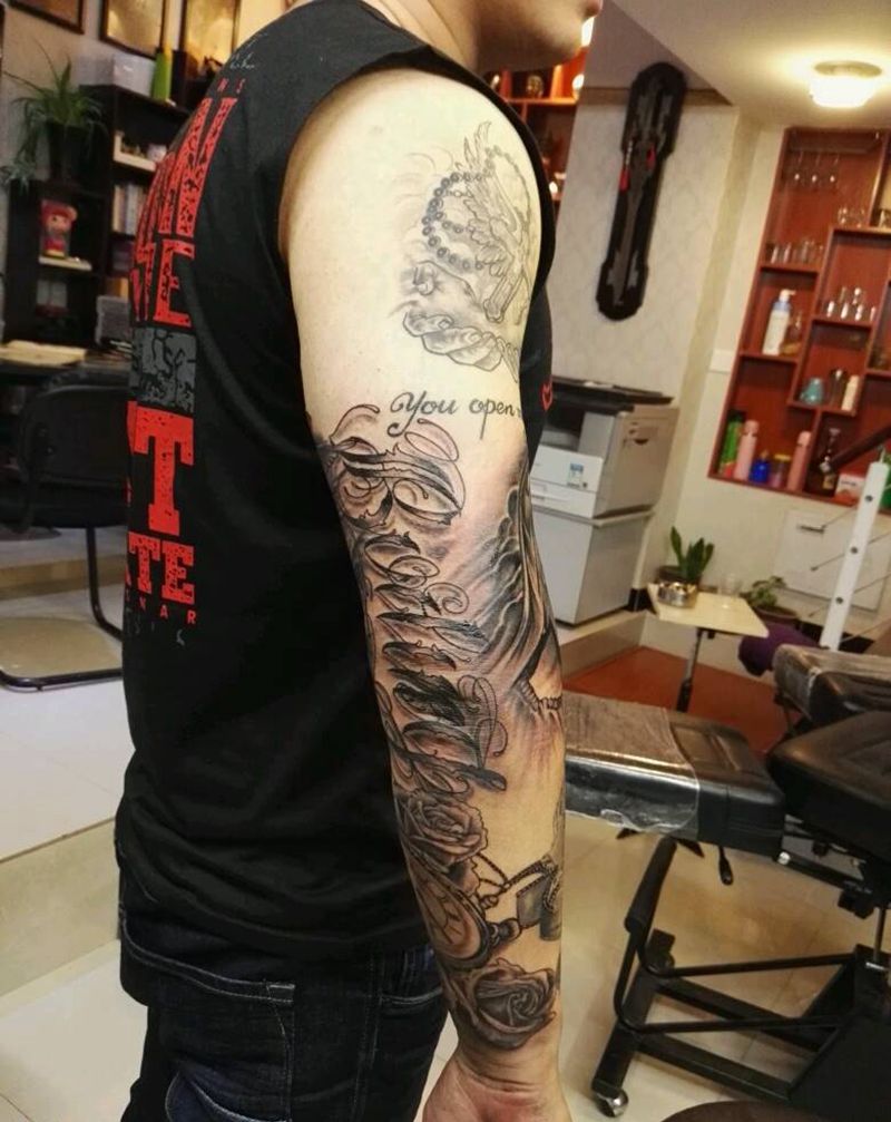 当前位置: 首页 >江苏省南京市纹身店-南京谢志-刺青 Tattoo纹身图案>花臂未完成纹身图片_手臂欧美人物宗教原创成品纹身图案