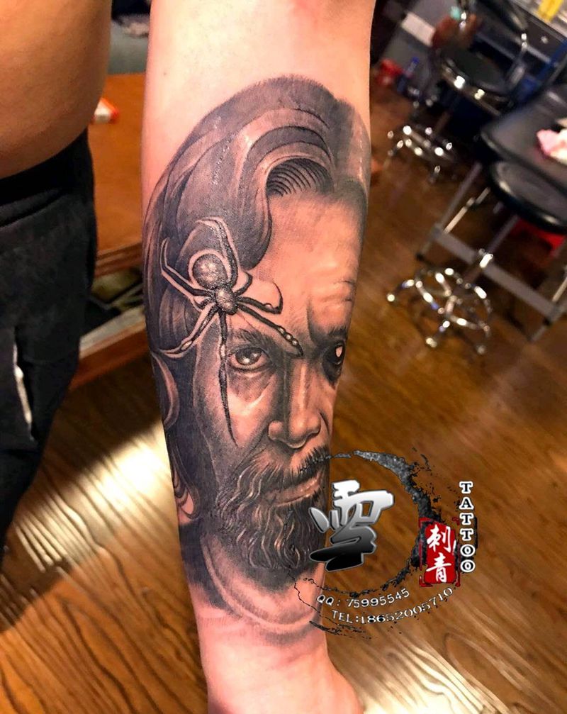 欧美肖像遮盖图腾纹身图片_手臂欧美肖像写实人物成品纹身图案