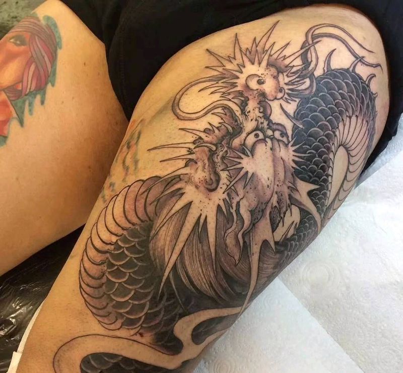 • T网红王老大花腿龙纹身图片_腿部新传统纹身图案