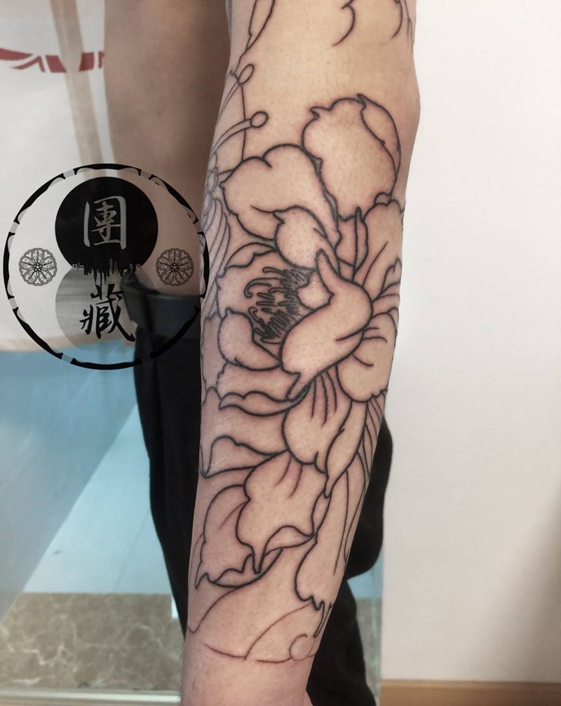 花臂线条纹身图片_成品手臂传统人物植物鬼神纹身图案