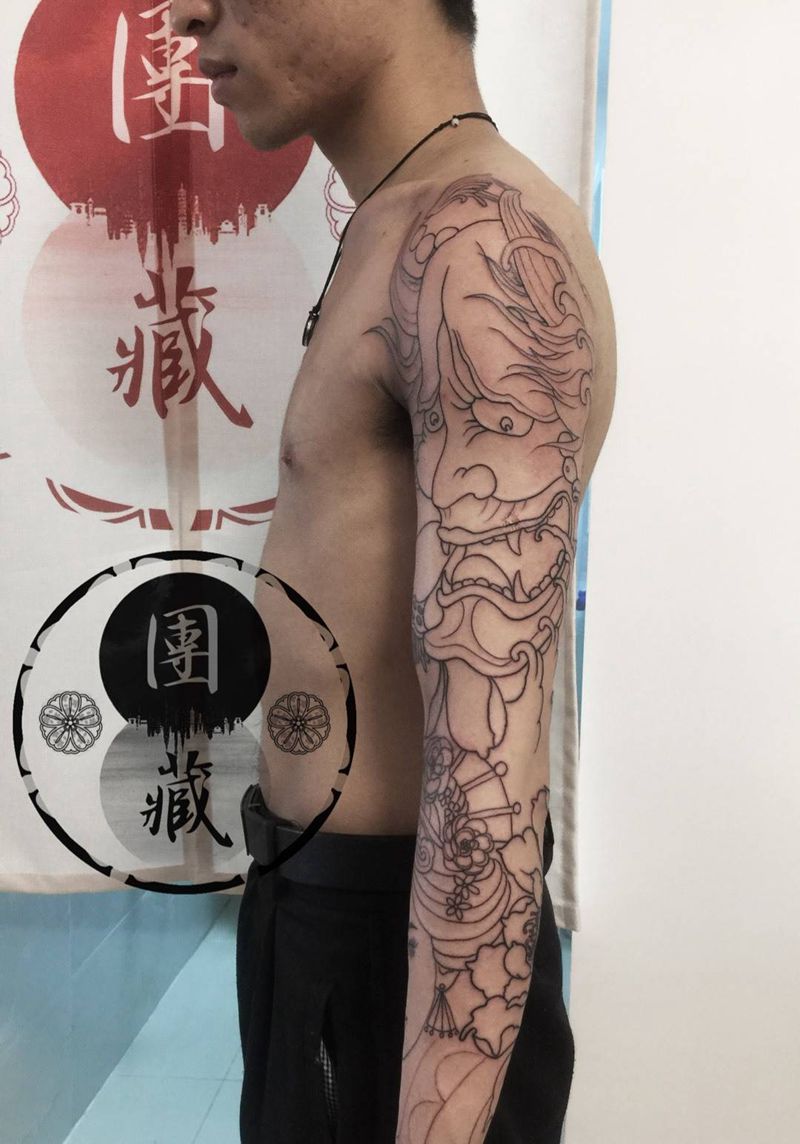 当前位置: 首页 >江苏省南京市纹身店-团藏刺青纹身图案>花臂线条纹身图片_成品手臂传统人物植物鬼神纹身图案