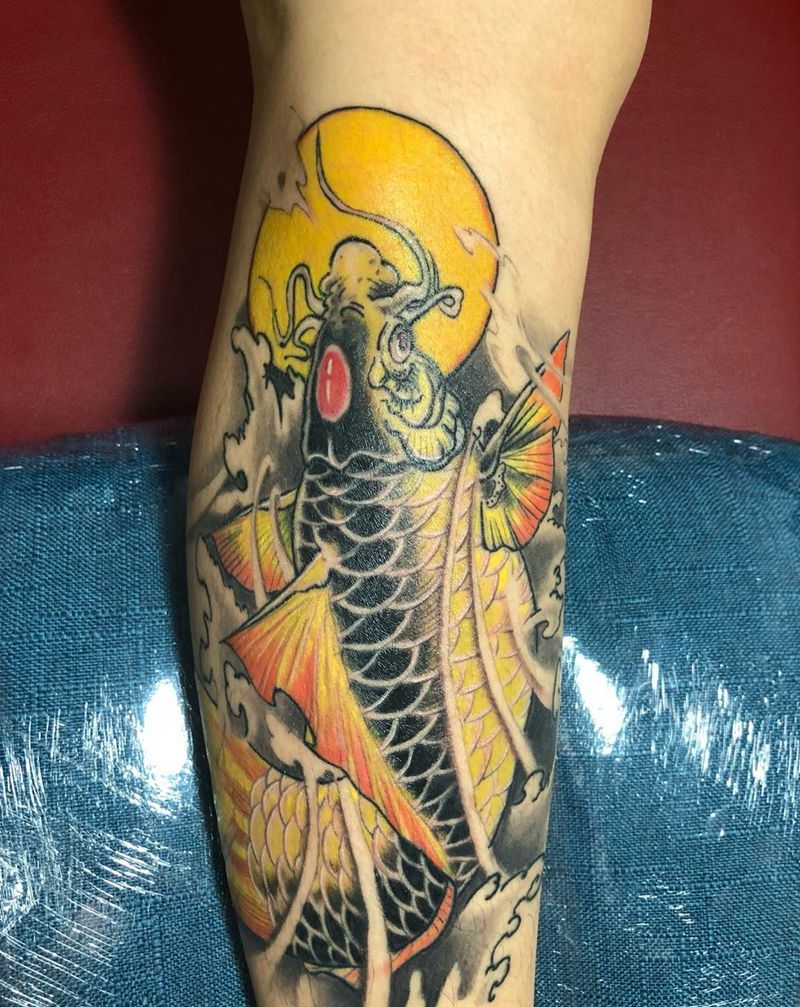 彩色鲤鱼纹身图片_腿部新传统水彩鱼浪纹身图案