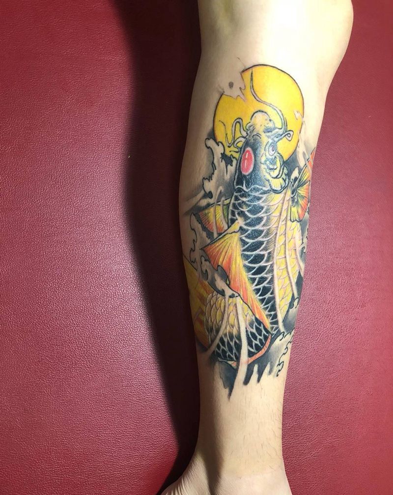 彩色鲤鱼纹身图片_腿部新传统水彩鱼浪纹身图案