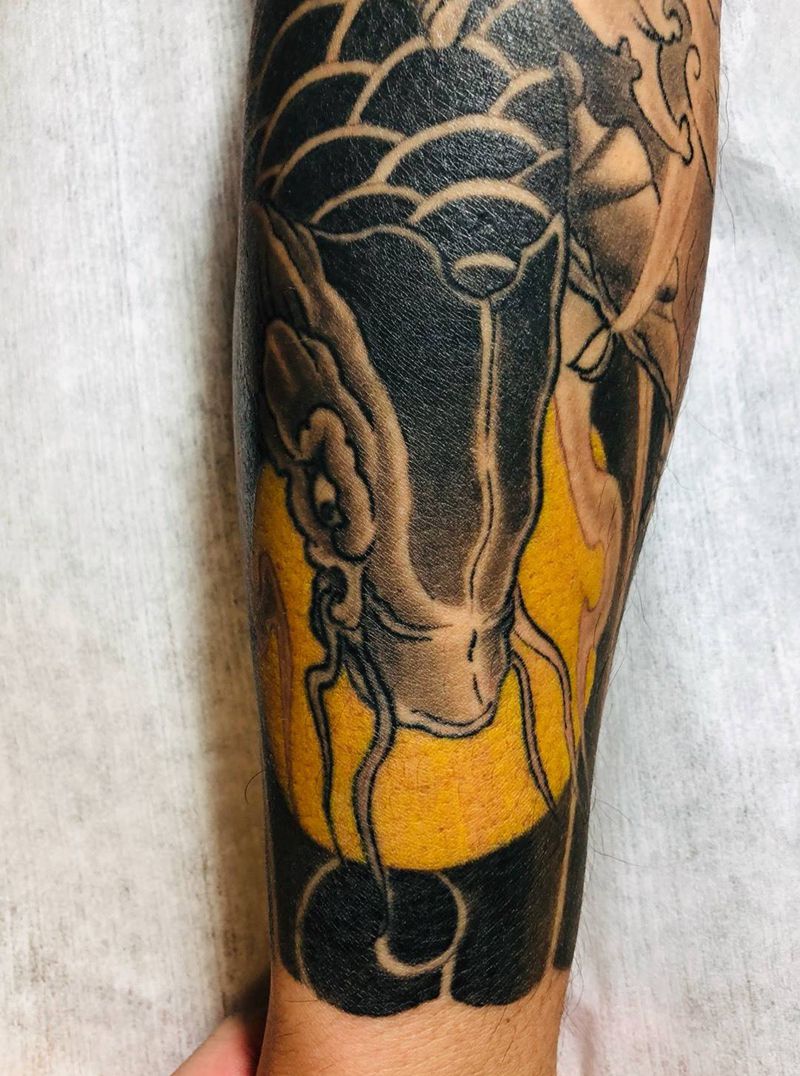 • T网红王老大花腿龙纹身图片_腿部新传统纹身图案