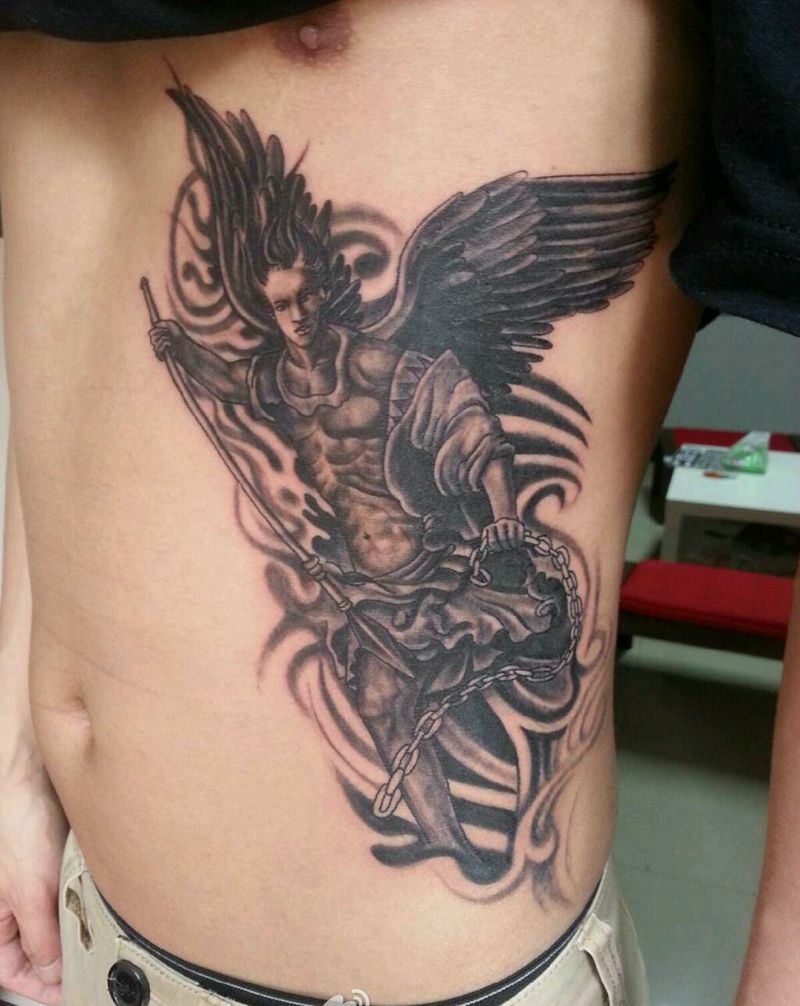 天使与锚纹身图片_腹部手臂欧美鬼神原创狂人刺青成品纹身图案