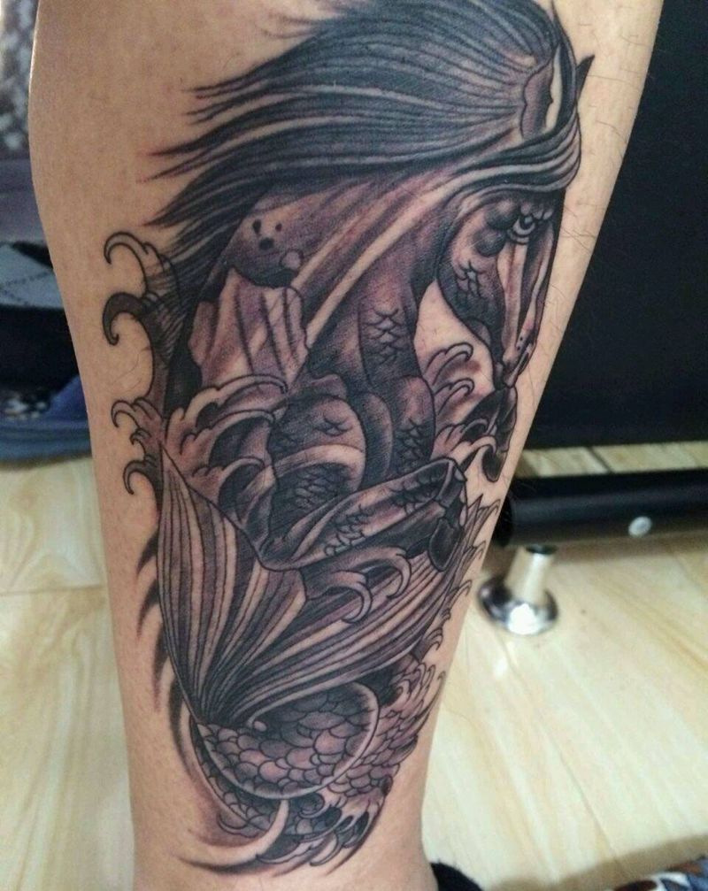 当前位置: 首页 >江苏省南京市纹身店-狂人刺青纹身机构纹身图案>马头鱼尾兽纹身图片_腿部欧美动物狂人刺青成品纹身图案