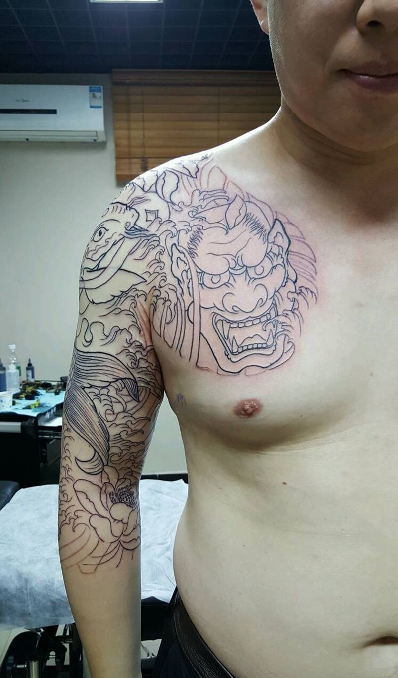 未完待续的七分袖纹身图片_肩部胸部手臂传统人物植物鬼神狂人刺青成品手稿纹身图案
