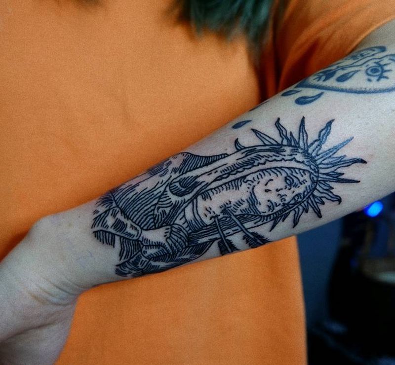 当前位置: 首页 >江苏省南京市纹身店-刺青商店Tattoo Shop纹身图案>黑灰圣母纹身图片_手臂纹身图案