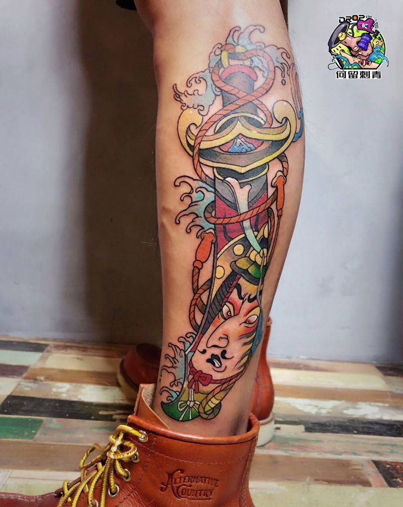 武士短刀纹身图片_腿部新传统水彩武士纹身图案