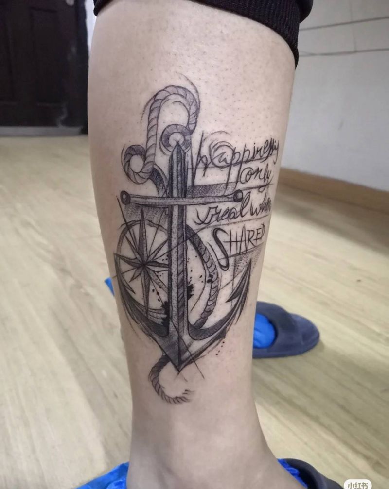 船锚、指南针与字母上身⚓️纹身图片_腿部点刺水墨纹身图案