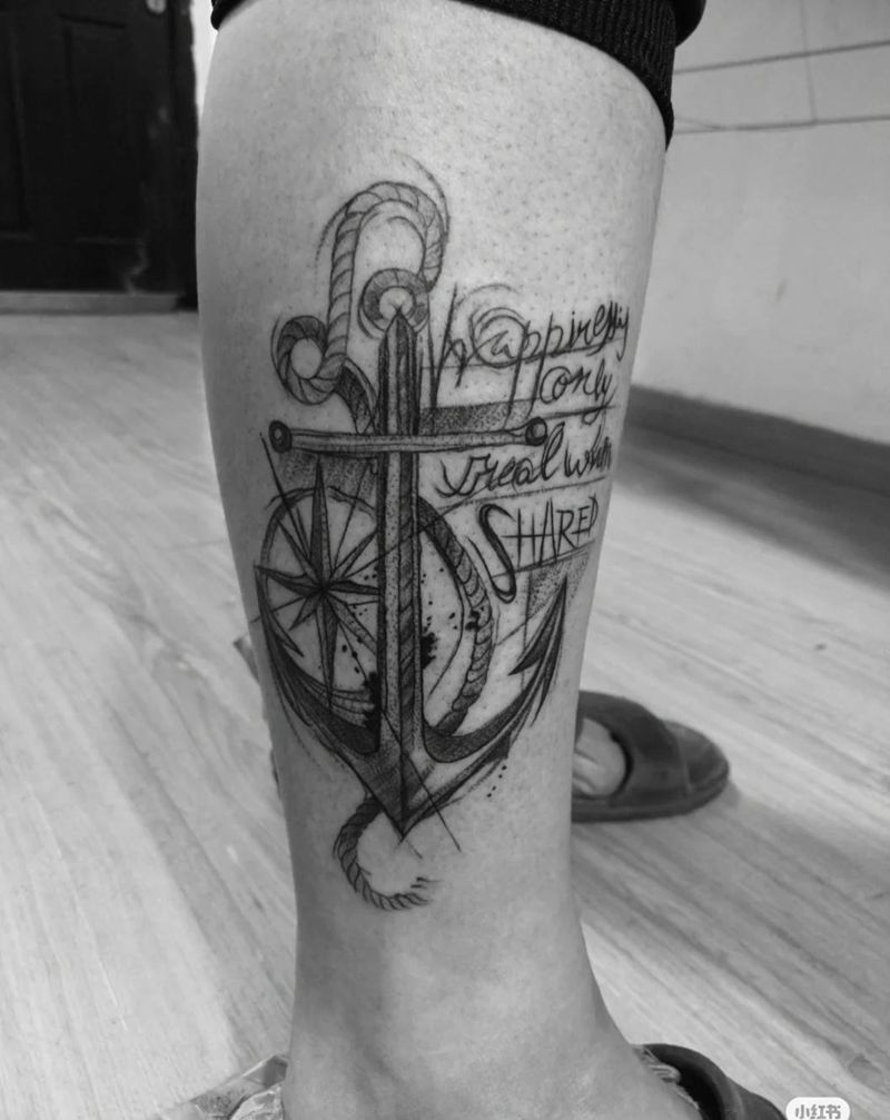 船锚、指南针与字母上身⚓️纹身图片_腿部点刺水墨纹身图案