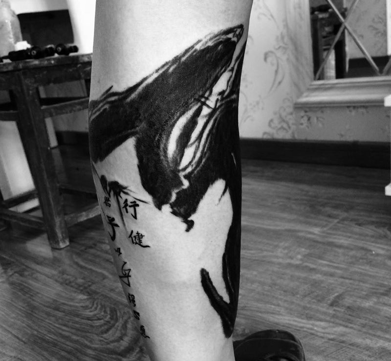 泼墨风格遮盖纹身图片_腿部国画字符成品纹身图案