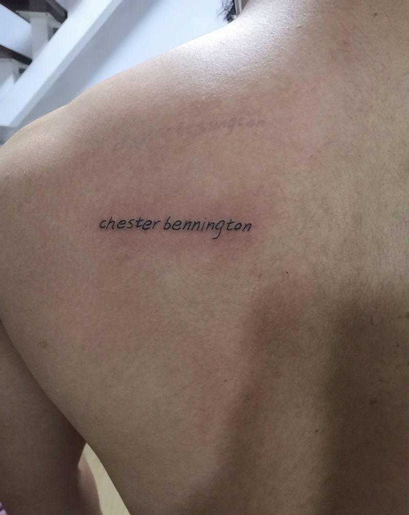 爱好健身的小哥哥,极具纪念意义纹身图片_背部花体字纹身图案