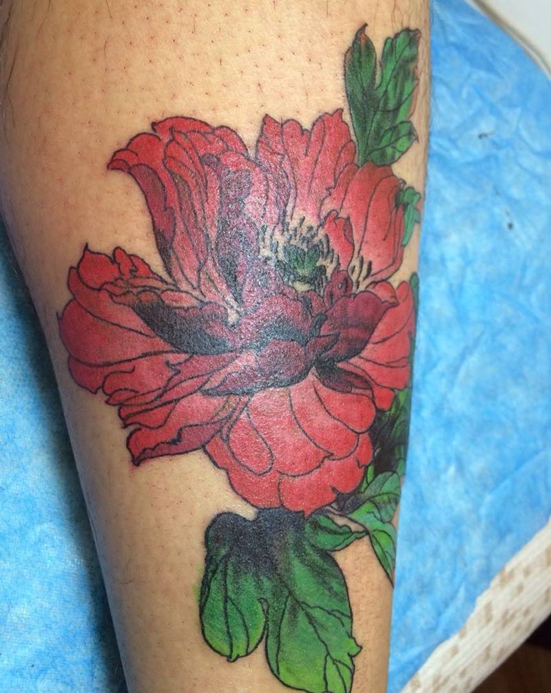 血色牡丹纹身图片_腿部传统静物成品纹身图案
