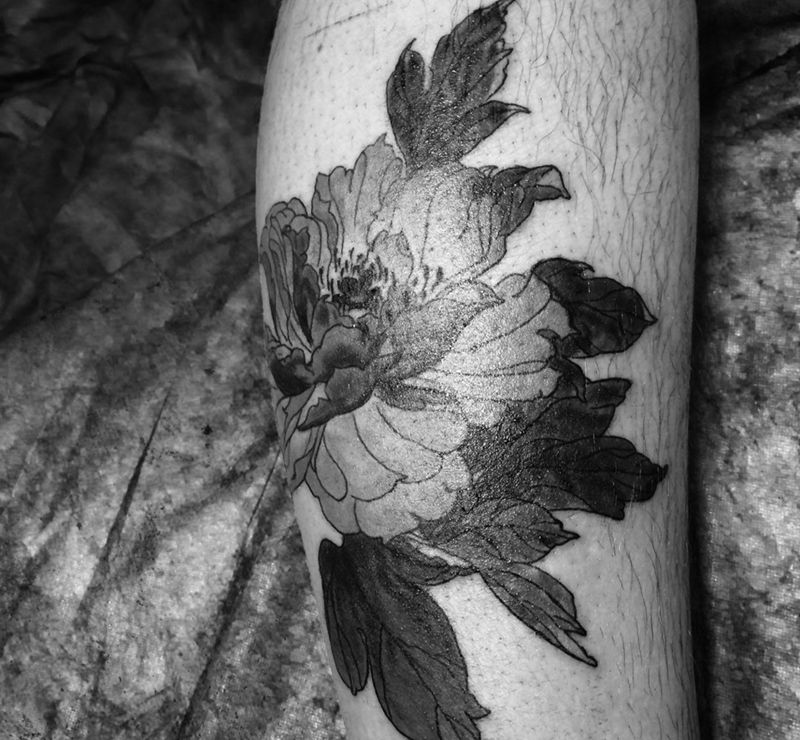 血色牡丹纹身图片_腿部传统静物成品纹身图案