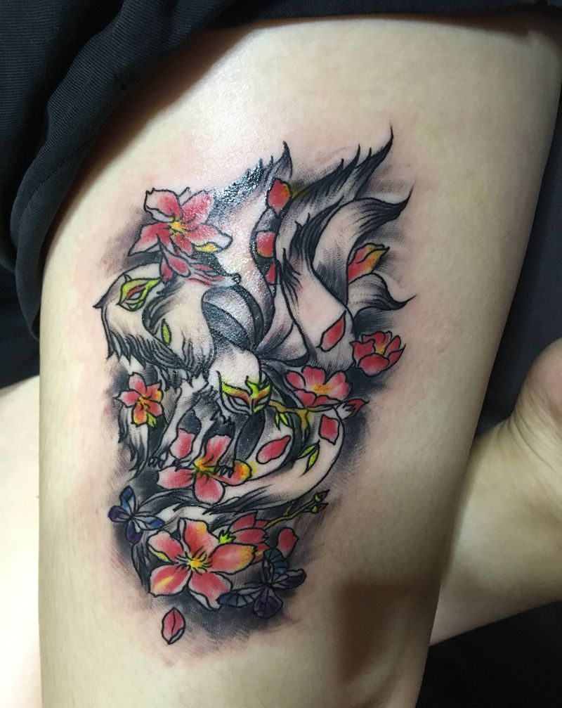 九尾狐纹身图片_腿部纹身图案