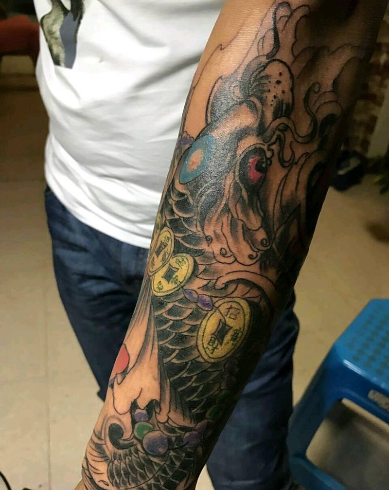 当前位置: 首页 >江苏省南京市纹身店-魔山刺青纹身图案>鲫鱼莲花纹身图片